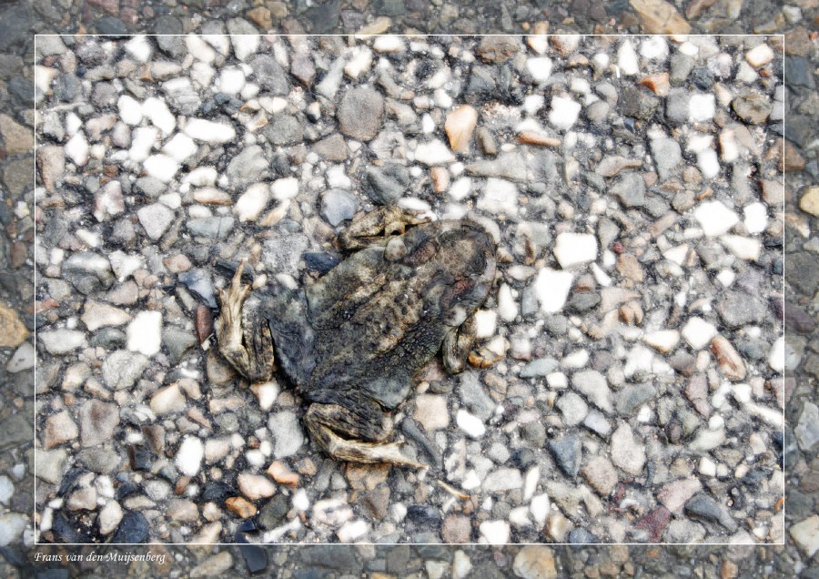De Dijk bij Weurt tijdens de Kolpingmars, een platgereden kikker op de dijk, 9 juli 2006, © Frans van den Muijsenberg.