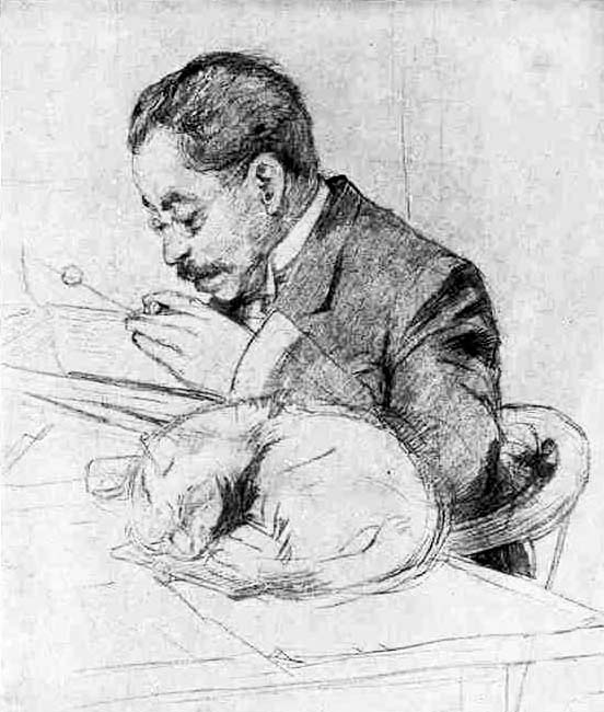 Twee maal een tekening van Arnold Aletrino, rechts in zijn jonge jaren getekend door Frederik van Eeden en links op latere leeftijd door D.A. Bueno de Mesquita, een tekening die is gemaakt in het Zwitserse verblijf van de auteur, Chalet Georges-Maurice in Chernex.