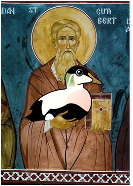 Eens namelijk, toen enkele raven gedachteloos zijn gerst stalen en stro van zijn dak weghaalden, berispte Cuthbertus hen daarover en verzocht hun dit nooit weer te doen. Zó beschaamd waren de vogels dat zij om hun berouw te tonen hem een groot stuk vet brachten. Maar hij wilde dit niet eten zoals zij verwacht hadden, maar gebruikte het voor andere dingen. Cuthbertus had al deze vogels zeer lief, voornamelijk de onzelfzuchtige eiderganzen, die het dons uit hun eigen borst plukken om het nestje voor hun kleintjes zacht te maken. Hij was altijd goed en vriendelijk voor hen, zodat zij helemaal niet schuw voor hem waren. Maar hij vreesde dat anderen, nadat hij heengegaan zou zijn, wellicht minder goed voor zijn lievelingen zouden zijn. Om hen te beschermen deed hij een plechtige gelofte en maakte hen de gave van zijn innerlijke vrede. Niemand op het eiland zou een van hen enig leed kunnen aandoen of hen doden zonder daarvoor een vreselijke straf te ondergaan. Hij gaf hun deze gave mee tot aan het einde der tijden, waardoor het voortaan ieder die een van Sint Cuthbertus’ vogels leed zou doen, slecht bekomen zou. Er bestaan twee geschiedenissen hiervan, die allebei gebeurd zijn, lang reeds nadat Cuthbertus van het eiland, was heengegaan.