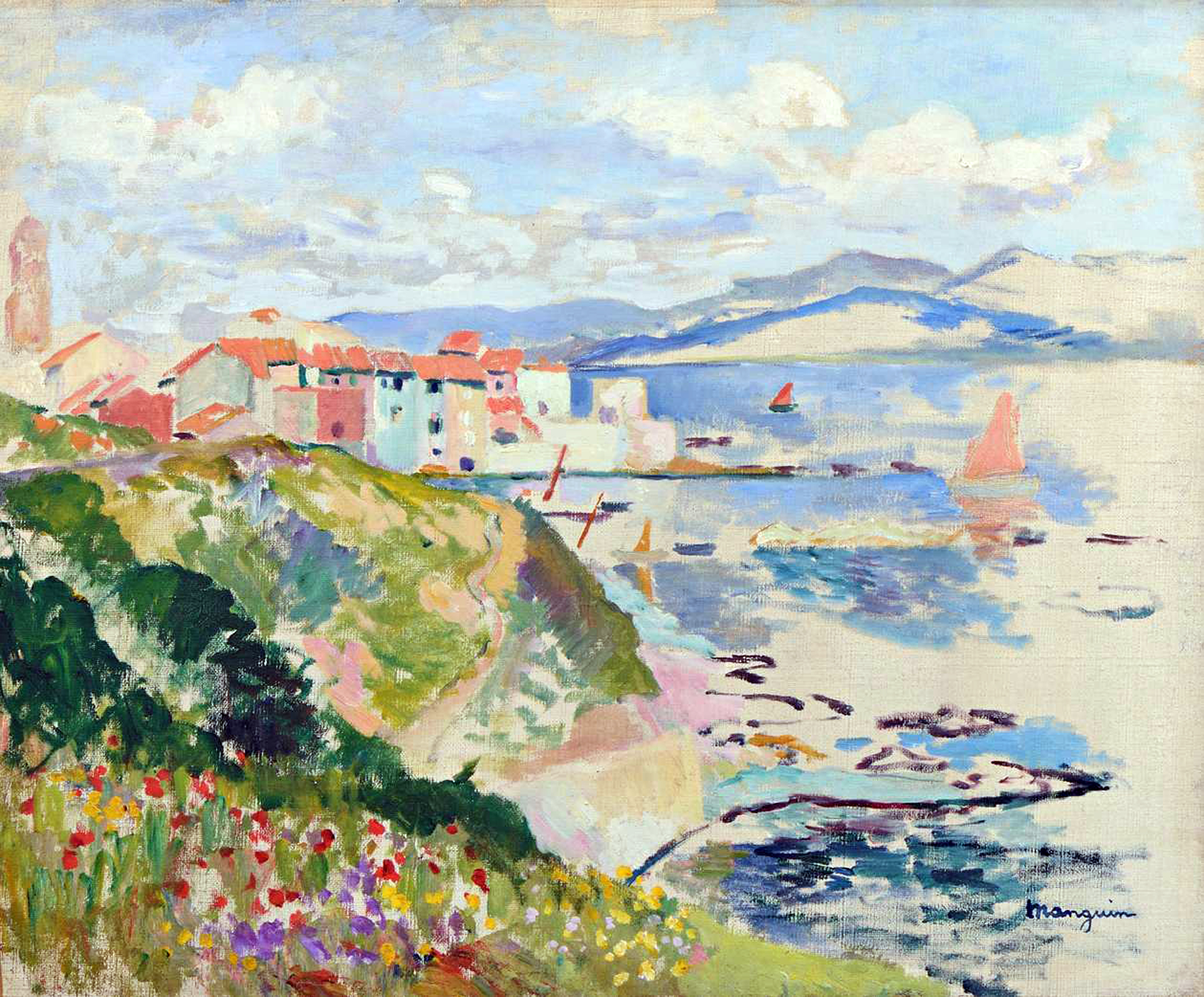 In 1900 heeft Henri Manguin zijn eerste expositie in Gallerie Berthe Weil. In 1902 doet hij mee aan de tentoonstelling in de Salon des Indépendants, waar hij nog vele malen zal terugkeren. In 1905 doet hij met vijf schilderijen namens de fauvisten mee aan de Salon d’Automne. Later dat jaar exposeert hij ook in andere galerieën, zoals Druet, Vollard en Bernheim. In 1904 heeft Manguin Saint-Tropez ontdekt, waar hij enthousiast is over de hoeveelheid licht, de vegetatie en de schoonheid van het landschap. Hij huurt hier in 1905 Villa Demiére. Vanaf die periode zijn veel van zijn schilderijen enorme mediterrane landschappen , die tot de hoogtepunten uit zijn werk kunnen worden gerekend.
