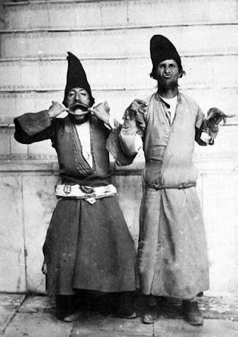 Naser had in zijn uitgebreide paleis een aantal hofnarren in dienst (misschien is ‘in bezit’ een betere uitdrukking) om hem en zijn hofhouding te amuseren. Dat gebeurde volgens de zogenaamde ruhozi-traditie, die zich het best laat vergelijken met het Italiaanse commedia dell’arte. Op het eerste gezicht lijkt het duo toch vooral op twee armoedzaaiers die even voor de fotograaf wat gekke bekken trekken. Andere leden van het gezelschap zien er niet veel beter uit.
