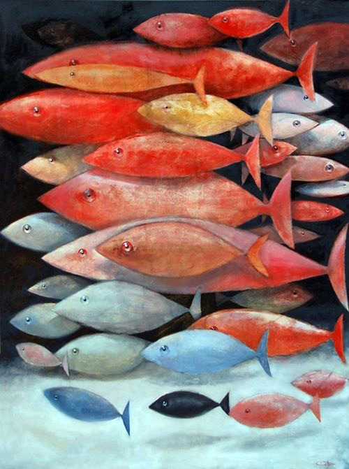 Schilderij van de Amerikaanse schilder Christopher Dotson, die woont in Charleston, South Carolina. Hij maakt fraai werk, maar is blijkbaar erg ondergewaardeerd. Op internet is namelijk slechts een enkele verwijzing naar zijn werk te vinden. Op een van de spaarzame site waar hij wat uitgebreider aan bod komt, zegt men over hem: “The inspiration for most of his work is nature. He is particularly interested in the spiritual meaning of nature. Chris states this about his art: “In reducing the complexity of natural forms, and recreating them I can gain a better under-standing of their meaning. I exclude details that are irrelevant or distracting. In my most recent work I have been focusing on simple natural forms, such as fish. I purposely leave out details such as side and dorsal fins, or markings because I do not want the type of fish to have influence to the overall meaning of the work. I want the fish to be seen as natural forms primarily. They are given meaning by their behavior, for example as a school of fish. Christopher works and creates primarily in oil paints, which to him, is among the most versatile materials. He has no specific technique in my mind when working on a painting”.