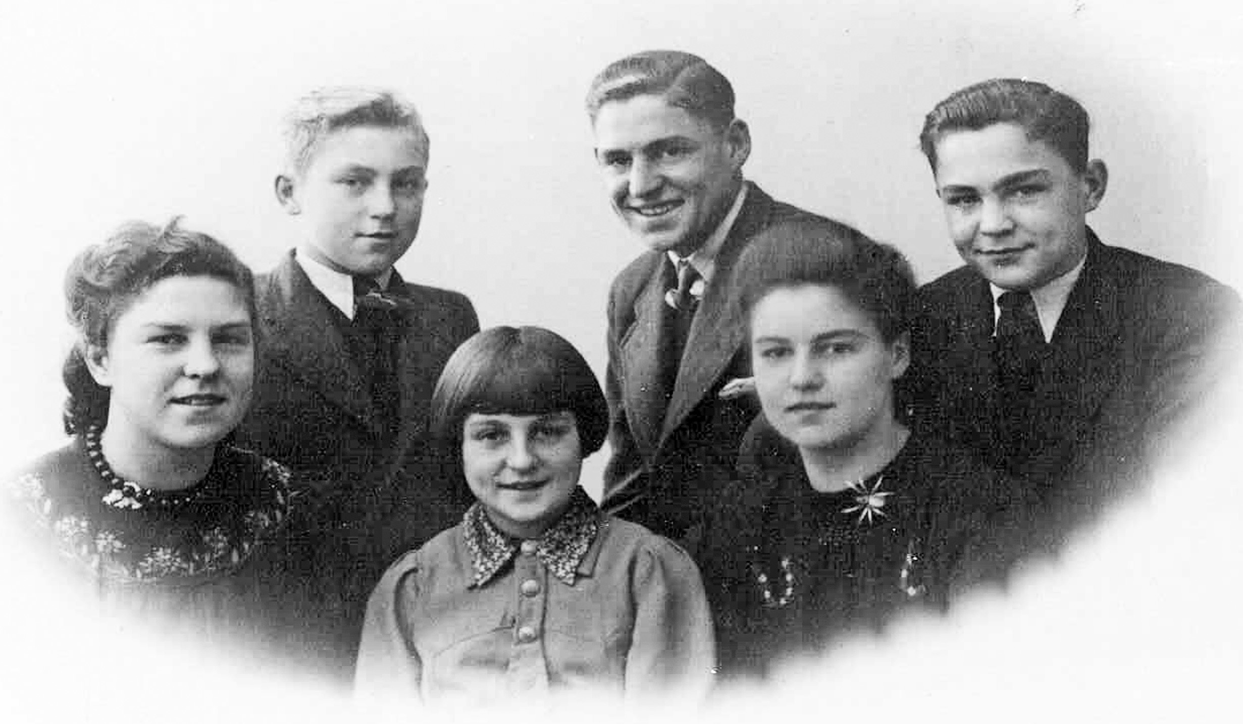 De kinderen Van den Broek met voor de dochters Makkie, Mimi en Cora; achter staat de broers Gerrit, Jaap en Arie.