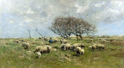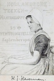 Groote liefheid – ánders weet ik het speciale in Mauve’s talent niet te benoemen – is het karakter ook van deze teekening. Het is liefheid, die niet duldt dat het licht anders dan van een stille, gelukkige, al doordringende avondlijke klaarheid zou zijn; dat dát boompje anders dan fijn en hoog zijn rijzende blâren in dat licht zou opdragen, dat die grond grof; dat hek hard, dat huisje brutaal, dat veldje gemeen er uit zou zien. Die den herder een rustig herder, het vrouwtje tot een aardig vrouwtje maakt, die zich, als of dat vanzelf spreekt, zoo héel graag uit in schapen, zonder ploertige grofheid, maar hun snoeten geeft om te kussen, zoo lief zijn ze; en houdingen van zachtheid, onnoozelheid en beminnelijkheid; – die hun wol tot glanzende zij maakt en het licht laat blinken op hun witheid. Liefheid, die zich groot en zelfgenoegzaam voelt, zóó zelfs dat zij versmaadt het teekenen van bestudeerde wetenschappelijkheid, van verstandige, afgepaste waarneming, het weten dat een poot zoo is, het berekenen dat een kop zus moet zijn, en afwacht, blij in zichzelven, het zeggen van verstandige kijkers: dat dit schaap geen pooten, en dat schaap twee ruggen heeft, – om niets anders te begeeren en te doen dan het uitdrukken van die groote, oppermachtige liefheid in een éenigen, klaren, onuitgerekenden indruk, zóo gegeven omdat hij zóo ontvangen is.