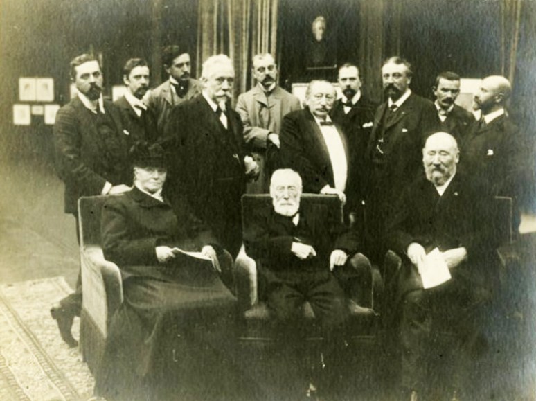 Zittend v.l.n.r. mevr. S. Mesdag-van Houten, Jozef Israëls, H.W. Mesdag. Daarachter v.l.n.r. : B.J. Blommers, Willem Maris en F.J. van Rossum du Chattel. Achterste rij v.l.n.r. Albert Roelofs, J.H. van Mastenbroek, Willy Sluiter, Jan van Essen, W.E. Roelofs jr, Fl. Arntzenius en Isaac Israëls.