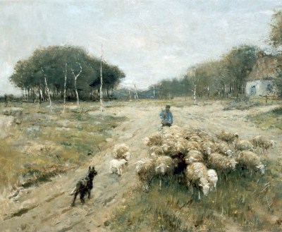 Achter-boven het hakhout gloeien de oranje en gele avondstrepen, en juist waar het hout en de afglooiende huisjes haast raken, gaat een slank, hoogstammig boompje in het lichtste luchtvak omhoog, waar het licht omheen en naar boven fijn vergrijst in de lucht. En de herder met den rug naar het licht, en het vrouwtje met het oog naar de hei, en de schapen tegen het hek, staan zichtbaar in die lichte atmosfeer, die den grijzen grond heeft verfijnd en het hek ontruigd, en blinkt op de wol, die fijnvlokkig glanst als van vloszijen vachten; – en het licht vergaat over de fijnbruine snoeten vooraan, en die zich opsteken van achter, in het donzige bruin van schaduw en dicht afhangende wolrafels. Met de stemmig-bruine huisjes zijlings er achter, waar de schemering tusschen breede bladeren langs heen vaagt in open venster, staat dat heele visioen attentief, met een klare droomerigheid, als een lieve, groote, onstoorbare werkelijheid.