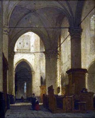 Daar is een goudachtige gloed in de sculptuur van om de zuilen gebouwde banken, in de gebeeldhouwde psalmbordjes, in een stoel, die daar niet op zijn plaats staat, in een stuk besneden lambriseering. Geelkoperen luchters hangen af van de gewelven en de goudglans van houtwerk en koper vergaat in den geligen schijn van oudwordend kalkpleister. Een mannetje zit in een bank en koper zijn de sloten van den Bijbel en geel als van zuiver goud de sneê, die zich uitbreedt in de schuinte, op het bruine bankblad. En als men gaat letten op het licht, dan ziet men het donker zijn in dien zijgang, tot daar in de verte waar hij gekruist wordt; maar het licht viert feest in het schip en schemert wat hooger in de beuk over de kerkbanken heen. Het is of daar uit de laagte van dien zijgang het licht is opgetrokken naar boven, en beneden blijft het donker, maar naar boven wordt het altijd lichter, tot hoog in het schip van de kerk, waar een groot, gelukkig klaar licht rustig schijnt, niet in vlagen, maar daalt en het ruim wijd maakt met helderheid. En als men dat ziet en daaraan denkt, dan merkt men hoe onder in dien zijgang alles vol is, een volte van rijke sculptuur en zware bruinachtige goudgloed, maar hoe alles wordt opgeruimd naar boven, waar de rustige zuilen uitrijzen boven ’t omkleedsel en niets dan bogen zijn, die in kalme streving, zonder aanmatiging dan hun gestadige stijging, elkaar zoeken in een enkel knooppunt. Dan voelt men het begrip van een kerk van Bosboom en het begrip van het geloof, het Protestantsche, dat zich ook in zijn kerken gesymboliseerd vindt: uit de aardsche schemering naar het hemelsche licht, uit de aardsche volte, die wel mooi is, naar de hemelsche ruimte met haar éene voleinding.