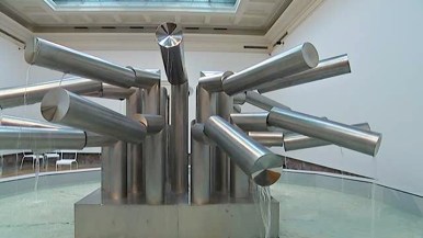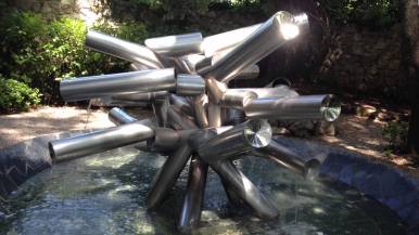 Drie beeldhouwwerken van Pol Bury: De Pol Bury-fontein in Brussel (boven), een fontein in St. Paul-de-Vende (links) en Le temps en mouvement in het Palais des Beaux-Arts de Bruxelles (Bozar)