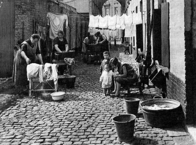 De huizen staan dicht opeen en zijn verveloos en verwaarloosd. ’s Zomers, als andere straten blakeren in den zonneschijn en de straatsteenen heet zijn als ovensteenen, schijnt door deze een kille grafwind te waaien. De kou slaat u om het hart, als ge er eenen blik in slaat. Het spelen van enkele groepjes kinderen in den namiddag verhoogt nog de akelige eenzaamheid, de kelderachtige stilte. Het is, alsof de sombere gevels, kregelig als ouden kunnen zijn, dreigen de rustverstoorders te verpletteren. Men zou meenen, dat de bewoners zich reeds ter ruste begaven, als men niet wist, dat velen dit ternauwernood ’s nachts kunnen. Onze voetstappen klinken hol en gaat men een winkel binnen, dan kunnen de bewoners van alle huizen bijna, de bel hooren overgaan. Alleen de zware wagens van de brouwerij, aan het einde der straat van donkerrooden baksteen opgetrokken, brengen leven. Ze doen de ongelijke straatsteenen dreunen, de ruiten trillen.