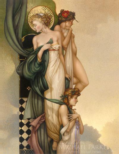 Michael Parkes (Sikeston, Missouri, 1944) is een Amerikaanse kunstenaar, woonachtig in Spanje. Zijn bekendste werken zijn geïnspireerd door fantasy en magisch realisme. Hij is gespecialiseerd in schilderen, steenlithografie en beeldhouwkunst. Zijn werk is op grote schaal beschikbaar in de vorm van posters en hij heeft negen boeken gepubliceerd. U zou eens een kijkje kunnen nemen op zijn eigen website, op die van Steltman Galerie, die van Galerie Honingen of simpelweg onder Google Afbeeldingen. Hij volgde eerst een opleiding grafische kunst en schilderen aan de University of Kansas in Lawrence, gaf daarna een tijdje les aan Kent State University in Ohio en aan de University of Florida. Opgegroeid als deel van de hippie-generatie besloot hij in 1968 een wereldreis te gaan maken, als onderdeel van zijn vormingsproces naar ‘een volmaakt kunstenaar’. Samen met zijn vrouw Maria trok hij eerst door Europa en daarna bezocht hij India, Nepal en Pakistan. Vooral zijn ervaringen in India, waar hij filosofie studeerde en zich ook verdiepte in de esoterische kennis in het Oosten was van enorme invloed op zijn werk. Zijn beelden getuigen van grote kennis van de kabbalistische en tantraïsche wijsheden, dit alles vermengt met zijn eigen fantasie en de traditionele West-Europese mythologie en sprookjeswereld. In 1975 vestigde hij zich definitief in Spanje. Nadat hij aanvankelijk nog tamelijk abstract had geschilderd, precies zoals zijn leermeesters dat altijd hadden bijgebracht, begon hij hier steeds meer te schilderen in zijn kenmerkende stijl, met veel aandacht voor details die hem in de gelegenheid stelde om zijn imaginaire beelden op het doek helemaal tot uiting te laten komen. Op die doeken ontmoeten eigenaardige dieren mysterieuze, engelachtige vrouwen; goed en kwaad vechten er hun onbekende conflicten uit in een blijkbaar haast gewichtloze omgeving.