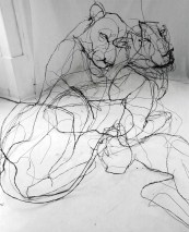 David Oliveira (Lissabon, 1980) is een Portugese kunstenaar, die in 2008 aan de Faculdade de Belas artes de Lisboa zijn diploma beeldhouwen haalde en zich daarna verder bekwaamde voor een (niet-voltooide) opleiding tekenen en anatomie. Hij was inmiddels begonnen met het maken van driedimensionale beelden waarvoor hij draad gebruikte. Die techniek wist hij steeds verder te perfectioneren en er later een vierde dimensie aan toe te voegen, namelijk beweging (‘… an eternal motion that allways be there and was’). Hij houdt zich niet alleen bezig met het op die manier creëren van beelden van mensen en dieren, maar ook van beelden die refereren aan maatschappelijk belangrijke onderwerpen zoals de uitbuiting van dieren, slavernij, de vleesverwerkende industrie. Een van de onderdelen waarover hij zich steeds heeft uitgelaten en heeft uitgebeeld betreft de culturele traditie in Portugal van het stierenvechten (die overigens al aanzienlijk minder bloedig is dan die in het buurland Spanje). Zijn ‘draadbeelden’ lijken net ruwe schetsen op papier, zeker als ze tegen een witte achtergrond worden opgehangen. Vanuit een verkeerde hoek lijkt het slechts een warboel kluwen van ijzerdraad die uit elkaar moet worden gehaald, maar door naar links of rechts te stappen en dus in de juiste hoek ten opzichte van het kunstwerk te staan, komt het ineens tot leven. In zijn later werken werkt hij met kleurrijke opvulling tussen de draden. Ander werk van David Oliveira is te vinden op zijn website, zijn Facebookaccount en via Google.