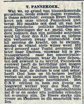 Tjeerd Pannekoek (Hornhuizen, Kloosterburen, 1 december 1886 – Mauthausen, 18 december 1944) nam binnen de Anti-Revolutionaire Partij (ARP) een vooraanstaande plaats in. Hij was gemeenteraadslid van Coevorden en lid van de Provinciale Staten va Groningen. Hij was verder hoofdbestuurder van de Nederlands Christelijke Landarbeidersbond (NCLB), die voor de oorlog een grote bond binnen de CNV was. Toen de oorlog uitbrak veranderde er de eerste maanden weinig. Op 16 juli stelde Suyss-Inquart een NSB-er aan het hoofd van de CNV, toen op 25 juli 1941 de bezetter probeerde de NCLB over te nemen, stapte het NCLB-bestuur op en waarna de bond werd opgeheven. Pannekoek ging in het verzet (schuilnaam Theo of Nap) en kwam bij de Verzetsgroep Garrelsweer, die onder leiding stond van Tjaako Zijlema. Door zijn vele relaties kon hij een belangrijke rol spelen binnen de LO. Hij werkte onder meer samen met de Nul-groep, de groep-Jaap Kroon en met verzetslieden als J.P. Gootjes en P. Gootjes. Pieter en Jacob Pieter (Jaap) Gootjes waren lid van een knokploeg en zo betrokken bij het gewapend verzet tegen de Duitse bezetters. In juni 1943 voerde hun knokploeg een succesvolle overval uit op het distributiekantoor van het Friese Langweer. Na nog een aantal overvallen besloten de leden van de groep onder te duiken. De gebroeders Gootjes verborgen zich in de buurt van Toornwerd, bij Middelstum. Ze werden in februari 1944 ontdekt door de Duitsers en er brak een vuurgevecht uit. Pieter (28 jaar) en Jaap (23) wisten nog te vluchten, de landerijen op, maar een van de broers raakte gewond. De ander wilde hem blijkbaar niet in de steek laten en zo werden beiden uiteindelijk doodgeschoten. Bij de hervormde kerk in Baflo is een monument ter herinnering aan de vijf slachtoffers van de Tweede Wereldoorlog uit het dorp. Ook de namen van P. en J.P Gootjes zijn erop vermeld. Ook een straatnaam in het dorp herinnert aan het tragische einde van deze twee zonen van de gereformeerde predikant van Baflo.