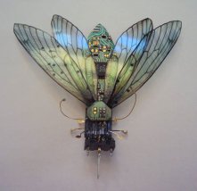 Julie Alice Chapell is een schilderes, fotograaf en beeldhouwster uit Portsmouth, die componenten uit oude computers en gameconsoles (van Nintendo gameconsoles tot oude dvd-spelers) haalt en vervolgens van deze componenten, voornamelijk chips, chipsecten maakt. Deze prachtige, van chips en andere computercomponenten samengestelde insecten verkoopt zij via Etsy en haar eigen website. Haar werk is inmiddels ook in allerlei galerieën en musea te zien en te koop, tegen schappelijke prijzen. Zelf zei de kunstenares over haar werk en het ontstaan ervan: ‘My art practice involves breaking down the pre-existing materials, reinterpreting them and offering them a new form with new purpose, creating something beautiful, whimsical and precious. It all started several years ago when she came across a big box of tiny electronic components at the Beneficial Foundation in Portsmouth, otherwise known as the “The Craft Bank.” The center receives unwanted items from various companies and they pass along these “hidden treasures” to schools, community groups and artists. The first thing that came into my head when I looked at them was, ‘a mass of tiny bodies and legs…ants!’ I took them home to my children and we made ants. It was only years later, when I found the box again, that it sparked a new idea. I was enrolled in a Fine Arts degree program and through it I realized that I can use found objects in her artwork. As part of my degree, I got involved with environmental art. During a workshop, I met some young artists who were creating life-size robots with circuit boards from computers. Though they abandoned their project, I took home the circuit boards because I found them “so visually appealing.” While watching a nature program on bio-diversity, I thought about the “ants” in the cupboard and proceeded to create various bug sculptures using my newly found circuit boards. Through the series, called Computer Component Bugs, I hope to raise awareness of environmental waste. The recycled bits of cultural refuse that are woven throughout my work represent a direct encounter with the excesses of modern living highlighting the dangers of planned obsolescence and e-waste in the environment. The work displays an aesthetic beauty whilst offering a socio-political discourse, attempting to reclaim waste and the destruction of the natural world, in the beauty of visual art.’