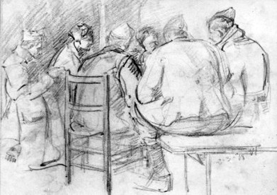 Waarschijnlijk was hij al niet meer aanwezig op de prijsuitreiking op 12 juli 1914 aan de Academie. Op 16 mei was Jozef namelijk opgeroepen voor zijn legerdienst. Hij moest zich melden in Sint-Niklaas voor een medisch onderzoek, werd geschikt bevonden en op 3 juli 1914 ingedeeld bij het 13e Linieregiment. Op 4 augustus 1914 brak de Eerste Wereldoorlog uit en als eind augustus werden Jozef en zijn regiment naar het frontgebied gestuurd. Op 14 oktober 1914 hergroepeerde het leger zich in de Westhoek. Aan het front bleef Jozef tekenen en schilderen in zijn vrije momenten. Aan teken- en schilderspullen kwam hij via Louise Van Goey, die ondertussen getrouwd was met Eduard Hernould en tijdens de oorlog in Ealing bij Londen verbleef. Zij stuurde hem regelmatig spullen op, waardoor hij kon deelnemen aan de tentoonstelling Kunst op den IJzer, die op 1 september openging in Nieuwpoort. Jozef viel er op met zijn ‘hoekige, karaktervolle koppen’ in houtskool en zijn aquarellen vol kleur. Een uitloper van deze tentoonstelling was de kunstenaarskring Kunst aan den IJzer, die in oktober 1916 werd opgericht door onder meer Maria Elisabeth Belpaire en Louisa Duykers. Maria Belpaire (Antwerpen, 31 januari 1853 – 9 juni 1948) was een Vlaams schrijfster en een mecenas binnen de Vlaamse Beweging (ze werd met goede redenen ‘de moeder van de Vlaamse Beweging’ genoemd) en het katholiek meisjesonderwijs. Gedurende de Eerste Wereldoorlog verbleef ze in De Panne, waar ze diverse tentoonstellingen organiseerden. Ze was ook de oprichtster van de frontsoldatenkrant De Belgische Standaard. Louisa Duykers (Antwerpen, 13 maart 1869 – Antwerpen, 20 december 1952) was een schrijfsters van katholiek getinte romans en novellen, van kinderboeken en een bundel reisimpressies. Samen met Belpaire en de dichteres Hilda Ram zou Duykers de vrouwelijke kern gaan uitmaken van de Vlaamse beweging alsook van katholieke vrouwenbeweging in Vlaanderen. De villa Swiss Cottrage in De Panne waarin de beide dames gedurende oorlogsjaren verbleven groeiden door hun activiteiten snel uit tot een ontmoetingsplaats van (katholieke) soldaten, brancardiers, priesters, studenten, politici, letterkundigen en kunstenaars die achter het front verbleven. ‘Un tourbillon de visites’, noemde Duykers het. Er werd een indrukwekkende waaier aan activiteiten ontplooid, onder meer ten bate van de verpleegsters en atelierarbeidsters. Voor hen wordt het tijdschrift Omhoog opgericht, dat ook in een Franstalige editie verscheen. Beide tijdschriften worden door Louise Duykers geredigeerd. En sinds oktober 1916 bestierden zij dus ook de kunstenaarskring Kunst aan den IJzer.