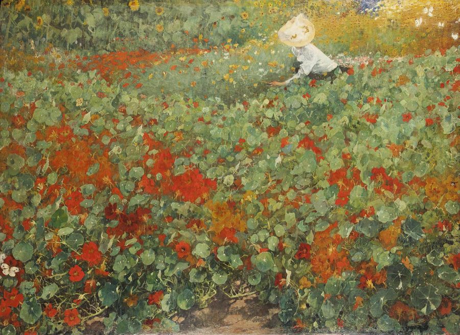 Op het schilderij is de echtgenote van de kunstenaar afgebeeld in een zee van bloeiende Oost-Indische kers. Het doek, aangeschaft van een particulier voor een verder onbekend bedrag, begint zich sindsdien in de Tweede Schilderijenzaal van Teylers. Het forse doek (97 bij 137 centimeter) is een van slechts vijf bekende grote bloemenschilderijen van Van Looy. Een ander werk, Zomerweelde uit 1900, bevindt zich in het Rijksmuseum. Teylers heeft één ander schilderij van Van Looy in bezit, maar dat is kleiner en door het gebruik van bitumen ernstig verdonkerd. ‘De tuin sprankelt van zichzelf’, aldus hoofdconservator Michiel Plomp van Teylers. ‘Het is een droomschilderij, mooier dan menig werk van Monet of Manet. Het is het meest impressionistische schilderij dat we in Nederland hebben.’ Van Looy schilderde De tuin in de zomer van 1893 in amper zes weken tijd, en plein air, in de achtertuin van zijn woning aan de Rustenburgerstraat in de Amsterdamse Pijp. ‘Het was een soort van wedloop tusschen mij en die snel rankende bloemen’, schreef de kunstenaar over het werk. Hoewel de bloemenzee tot in de verte door lijkt te gaan, beschikte Van Looy in werkelijkheid maar over een piepklein tuintje. Plomp: ‘Hij koos voor een zeer gedurfde compositie, met dat lage standpunt en de afwezigheid van een horizon. Het licht is ook fantastisch. Dat sluit aan bij wat de Franse impressionisten deden. Daarin was Van Looy in Nederland uniek.’ Toen Van Looy De tuin in 1894 in de Amsterdamse kunstenaarsvereniging Arti exposeerde, werd het werk kritisch ontvangen. De recensent van de Nieuwe Rotterdamse Courant schreef dat zo’n ‘brok, plompverloren uit de natuur gesneden’ niet als een echte compositie kon worden beschouwd. En: ‘Het had net zo goed de helft kleiner gekund.’ Maar collega Isaac Israels noteerde: ‘Het is het beste schilderij dat er is [in Arti], dus er is geen kwestie van of jij had de medalje moeten hebben.’