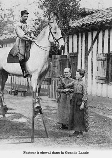 Les Landes is een Frans departement, dat deel uitmaakt van de regio Nouvelle-Aquitaine en wordt begrensd door de departementen Gironde, Lot-et-Garonne, Gers en de Pyrénées-Atlantiques. In het noorden ligt de metropool Bordeaux, in het zuiden stuit men op de Franse Pyreneeën. Verder grenst het aan de Atlantische Oceaan. Het departement was een van de 83 departementen die tijdens de Franse Revolutie werden gecreëerd toen op 4 maart 1790 een wet van 22 december 1789 tot uitvoering kwam en delen van de provincies Guyenne en Gascogne werden samengevoegd tot een nieuw departement. Het departement kent inmiddels een paar redelijk grote steden, zoals Mont-de-Marsan (30.162 inwoners) en Dax (20.528), maar overwegend kent men er slechts wat dunbevolkte dorpen die slechts in de zomermaanden worden overspoeld door hordes toeristen. Dat is niet zo verwonderlijk, want Les Landes heeft een kustlijn van maar liefst 106 kilometer, met vele fantastische zandstranden, prachtige duinenrijen, pittoreske dorpjes en schaduwrijke en uitgestrekte dennenwouden om te schuilen tegen de soms erbarmelijk hete zon. Dat was vroeger wat anders, want tot vroeg in de 20e eeuw bestond Les Landes uit een geweldig moerasgebied waar slechts heide op groeide. Om het gebied bewoonbaar te krijgen werden vanaf het eind van de 19e eeuw de bossen aangepland, die nu in totaal ruim 600.000 hectare beslaan. In dat moerassig gebied was het voor de bewoners essentieel goed te kunnen steltlopen. Het was de enige manier om snel en veilig te kunnen verplaatsen. Tegenwoordig zijn ‘les echasses’ nog slechts een folkloristische activiteit, een eeuw geleden kon men herders en ander volk zo zien rondlopen. Het was simpelweg de enige manier om zich snel te kunnen verplaatsen. Ook de postbode kwam dus al steltlopend langs en daar zijn ook mooie ansichtkaarten van gemaakt. Niet zo lang geleden trof ik een foto aan die zo’n ansichtkaart professioneel had gephotoshopt, wat leidde tot de vragen of dit echt mogelijk was en waar het in hemelsnaam voor diende.