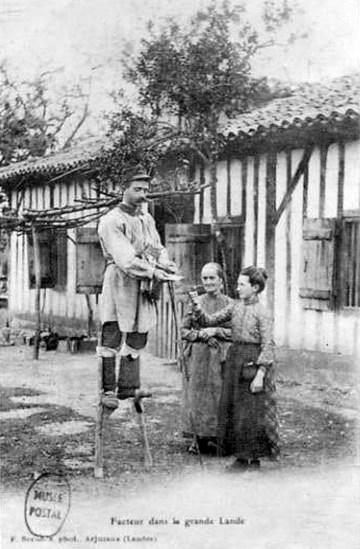 Les Landes is een Frans departement, dat deel uitmaakt van de regio Nouvelle-Aquitaine en wordt begrensd door de departementen Gironde, Lot-et-Garonne, Gers en de Pyrénées-Atlantiques. In het noorden ligt de metropool Bordeaux, in het zuiden stuit men op de Franse Pyreneeën. Verder grenst het aan de Atlantische Oceaan. Het departement was een van de 83 departementen die tijdens de Franse Revolutie werden gecreëerd toen op 4 maart 1790 een wet van 22 december 1789 tot uitvoering kwam en delen van de provincies Guyenne en Gascogne werden samengevoegd tot een nieuw departement. Het departement kent inmiddels een paar redelijk grote steden, zoals Mont-de-Marsan (30.162 inwoners) en Dax (20.528), maar overwegend kent men er slechts wat dunbevolkte dorpen die slechts in de zomermaanden worden overspoeld door hordes toeristen. Dat is niet zo verwonderlijk, want Les Landes heeft een kustlijn van maar liefst 106 kilometer, met vele fantastische zandstranden, prachtige duinenrijen, pittoreske dorpjes en schaduwrijke en uitgestrekte dennenwouden om te schuilen tegen de soms erbarmelijk hete zon. Dat was vroeger wat anders, want tot vroeg in de 20e eeuw bestond Les Landes uit een geweldig moerasgebied waar slechts heide op groeide. Om het gebied bewoonbaar te krijgen werden vanaf het eind van de 19e eeuw de bossen aangepland, die nu in totaal ruim 600.000 hectare beslaan. In dat moerassig gebied was het voor de bewoners essentieel goed te kunnen steltlopen. Het was de enige manier om snel en veilig te kunnen verplaatsen. Tegenwoordig zijn ‘les echasses’ nog slechts een folkloristische activiteit, een eeuw geleden kon men herders en ander volk zo zien rondlopen. Het was simpelweg de enige manier om zich snel te kunnen verplaatsen. Ook de postbode kwam dus al steltlopend langs en daar zijn ook mooie ansichtkaarten van gemaakt. Niet zo lang geleden trof ik een foto aan die zo’n ansichtkaart professioneel had gephotoshopt, wat leidde tot de vragen of dit echt mogelijk was en waar het in hemelsnaam voor diende.
