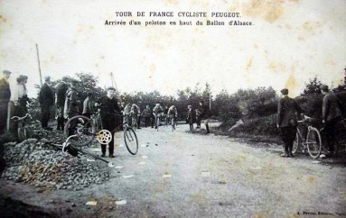 In de derde editie van de Tour de France kwam de organisatie met een noviteit. In de tweede etappe (10 juli 1905, Nancy-Besançon, 299 kilometer) stond de allereerste bergetappe in de ronde gepland. De rit zou worden gewonnen door Hippolyte Aucouturier, de latere winnaar van deze Tour Louis Trousselier eindigde derde. René Pottier, die als tweede over de finish zou komen, werd daar onsterfelijk door als enige zonder af te stappen deze hindernis te nemen. De berg, met een onverhard wegdek, beklom hij met een gemiddelde van 20 km/u. Het werd tevens zijn laatste wapenfeit in deze ronde, want een dag later moest hij met een ernstige knieblessure opgeven. Hierbij een tweetal foto’s om een impressie te geven onder welke omstandigheden het peloton toen de cols moest passeren.