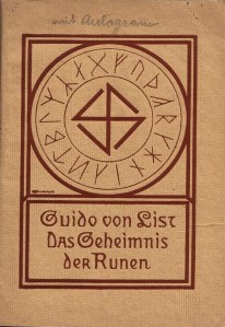 En dan was daar nog de runensymboliek. Ook hier speelde Guido List, die zichzelf tot de adelstand verhief door “von” in zijn naam te plaatsen om serieuzer te worden genomen, een sleutelrol. Hij schreef het boek Das Geheimnis der Runen, waarin hij de Armanen Futharkh ofwel de Armanenrunen beschreef. Het runenschrift is het oudst bekende schrift gebruikt, dat door de Germaanse volkeren van Noord-Europa, Groot-Brittannië, Scandinavië en IJsland vanaf de tweede of de derde eeuw tot de zestiende of zeventiende eeuw werd gebruikt. Het bestaat uit letters samengesteld uit meestal rechte en hoekige lijnen die gemakkelijk in bijvoorbeeld steen of hout kunnen worden gekrast. Von List verklaarde dat in 1902 aan hem deze Armanen Futharkh zouden zijn geopenbaard, terwijl hij in een elf maanden durende staat van tijdelijke blindheid verkeerde na een staaroperatie aan beide ogen. Dit visioen opende naar eigen zeggen zijn ‘innerlijke oog’, waardoor hem ‘het geheim der runen’ werd bekendgemaakt. List beweerde, en veel van zijn volgelingen geloofden hem, dat zijn achttien runen de ‘oer-runen’ vertegenwoordigen, waarop alle latere historische runenrijen waren gebaseerd. Het boek verscheen met een wat misleidende kaft, omdat er ook een swastika op stond. Het hakenkruis heeft echter nooit deel uitgemaakt van het Armanen Futhark en ook niet enige andere runenreeks.