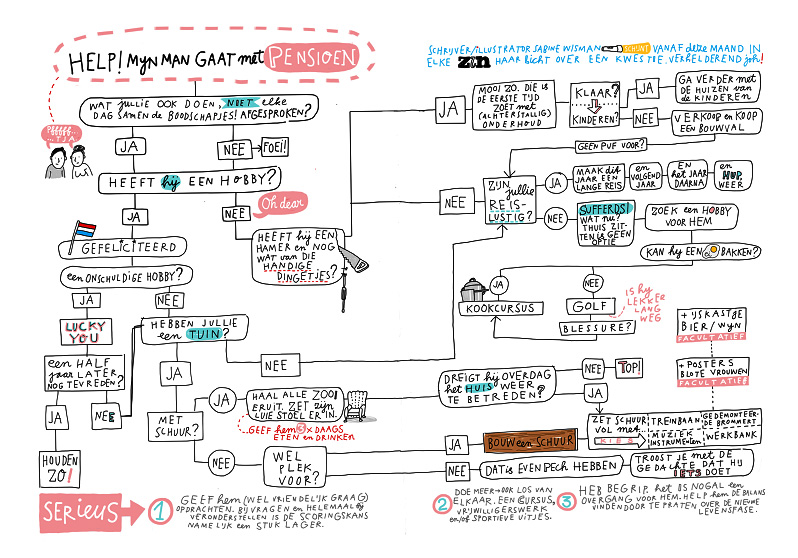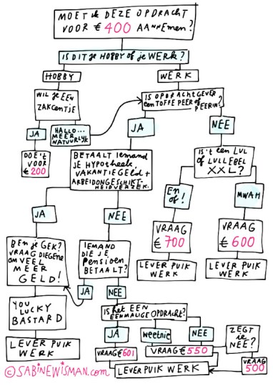 Sabine Wisman laat op haar site weten dat ze vroegtijdig de kunstacademie verliet en ging werken op een reclamebureau. Later volgde ik een schrijfopleiding, met als resultaat dat ze inmiddels zo’n twintig boeken en meer dan honderd columns in magazines heeft geschreven. Ook combineert ze haar twee liefdes (schrijven en tekenen) en ontwikkelde programma’s voor mensen met een creatief beroep en creatieve solo-ondernemers: Artist Wake Up Call en Creative Biz om creatieve ondernemers te begeleiden bij hun groei in zelfvertrouwen als centen. Wat dat laatste betreft zegt ze op haar website: ‘Geld. Je hebt het nodig voor huis, voeding en versiering. En hoe geweldig is het dat je het kan verdienen met doen waar je veel plezier in hebt? Ben je zelfstandige creatieve ondernemer (hallo fotograaf, vormgever, illustrator, schrijver, kunstenaar, ontwerper, artiest, maker), dan heb je naast dat plezier ook nog eens vrijheid. Iets waar ik persoonlijk nooit meer afscheid van wil nemen. Maar creatief én commercieel zijn is geen vanzelfsprekende combinatie en dat is zonde. Maar wacht … we’re here to help. Geld vragen voor iets wat je met zoveel plezier maakt is vaak een heikel onderwerp. Maken is jouw gave en een cadeau van heb-ik-jou-daar. Daarmee geld verdienen vinden we niet altijd makkelijk. Want ja, je doet gewoon wat je graag doet. Wat je moet doen, misschien, omdat het simpelweg is wie je bent. Het is eng om daar een bedrag aan te hangen. Dat kan ik met zekerheid zeggen na zoveel creatieve ondernemers in mijn programma’s te hebben gehad. Het is niet alleen eng in het prille begin van je creatieve carrière maar ook als je al een jaren bezig bent.’ Daar is geen woord teveel van gezegd, want als kleine ondernemer weet ik uit ervaring hoe lastig het is om te bepalen wat het juiste bedrag is om aan een potentiële klant te vragen. Sabine heeft dat dilemma op een aardige manier in beeld gebracht. Ze heeft er een zestal tips bij geleverd die hier na te lezen zijn. Doe er uw voordeel mee. Trouwens, ook voor andere problemen heeft ze handige en komische lijstjes.