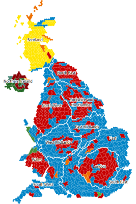 De Conservatieven hebben maar amper winst gehaald in deze verkiezingen, zodat gerust gesteld mag worden dat de boodschap van Boris Johnson (‘Get Brexit Done’) veel minder respons kreeg dan op basis van het districtenstelsel wordt geconstateerd. De partij haalde in 2017 bij de tussentijdse verkiezingen onder leiding van Therese May 43,6% van de stemmen, wat hen toen 317 zetels opleverde. De partij moest 14 zetels inleveren en kon slechts verder regeren door een coalitie aan te gaan met een marginaal Noord-Ierse partij, de DUP. Die uitslag leverde haar veel kritiek op en zou haar de rest van haar premierschap achtervolgen, maar vergeten wordt dat ze toen wel degelijk behoorlijke winst haalde. Het percentage stemmen dat May binnenhaalde steeg namelijk van 36,9% naar 42,4%. Maar dat is nu eenmaal een van de effecten van het Britse kiesstelsel: stijgen van 36,9% in 2015 naar 42,4% in 2017, maar in zetelaantal dalen van 331 zetels naar 317 zetels. Op basis van een stelsel van evenredige vertegenwoordiging zouden de Conservatieven echter slechts 276 zetels mogen hebben. Nu haalde Johnson slechts een marginale winst van 1,2%, maar het leverde hem een winst van maar liefst 66 zetels op. Eigenlijk maar 49 zetels, maar in alle polls wordt ervan uitgegaan dat de Conservatieven nog slechts 299 zetels hadden omdat er gedurende de