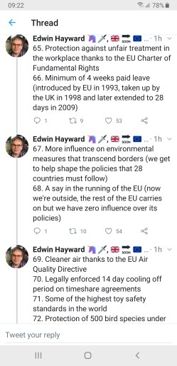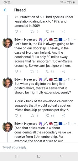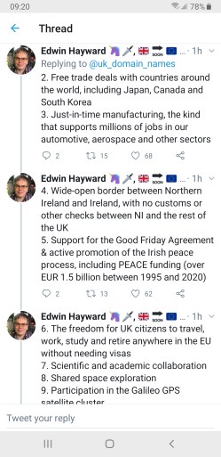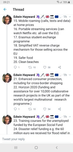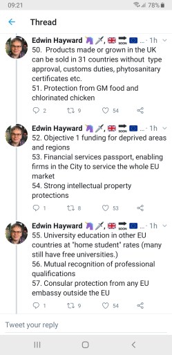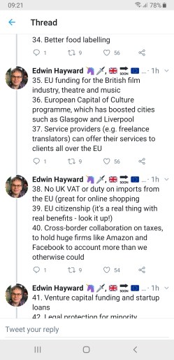 Eind vorig jaar schreef Edward Hayward een interessant boe over de Brexit: Slaying Brexit Unicorns; The truth about our decision to leave the EU. Hayward is studeerde informatica, verbleef na zijn afstuderen vijftien jaren in Japan en richtte zich na terugkeer in Groot-Brittannië op allerlei zaken die verband houden met het internet (beheren van websites, handel in domeinnamen, beveiliging, e.a.) Hij gaf met zijn boek een waarschuwing wat de Britten na de Brexit nog te wachten staat, want de onderhandelingen zijn aanstaande en zullen een aantal onneembare bergen op het pad naar de ‘control back’ opleveren. Hij geeft ook aan welke geheime agenda er achter de Brexit zat. Hij prikt door de diverse mythes die de hardliners met succes aan de onwetende massa wist te verkopen. Zoals het verhaal dat er snel mooie nieuwe internationale overeenkomsten zullen zijn omdat de buitenlandse handelspartners de Britse producten zo hard nodig hebben. Hij toont aan onder verwijzing naar de handelsovereenkomsten van de EU en van de WTO wat het in werkelijkheid gaat betekenen als de Britten op zichzelf staan. Via een aantal berichten op Twitter deelde hij op 5 februari mee dat hij die nacht een verwarrende droom had, die hem op een lumineus idee bracht: waarom sluit Groot-Brittannië zich niet aan bij de Europese Unie, om vervolgens 72 grote voordelen van zo’n lidmaatschap te geven. Ze staan in onderstaand overzicht.