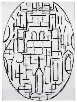 Vanaf 1917 verdween elk naturalisme, elke beweging en elke diepte uit het werk van Mondriaan. In zijn Larense-Berlicumse periode schilder hij slechts 32 schilderijen. Niet erg omvangrijk, maar het vertegenwoordigd een essentiële periode in het leven van de kunstenaar. De kunsthistoricus Louis Veen (1947), die gepromoveerd is op het werk van Mondriaan, schreef een boek (Schilderen en schrijven in Laren en Blaricum, uitgeverij IJzer, 2020) over deze periode. Hij merkt op dat in deze tijd in zijn schilderwerk vier essentiële veranderingen plaatsvinden, die uiteindelijk zullen leiden naar zijn neoplastische schilderijen in de jaren twintig en dertig: de volkomen tweedimensionale (vlakke) compositie, het tot-bepalend-stellen van kleur (kleur definiëren tot effen, rechthoekig kleurvlakken), de geometrisch-abstracte compositie en het ruitvormige schilderij. Veen verdeeld deze 31 werken die in deze jaren werden gemaakt vervolgens in tien groepen of series van werken, waarin hij laat zien hoe zich van lieverlee de stijl ontwikkeld. De eerste en tweede serie bestaan nog uit abstracte schilderijen waarin de kerktoren van Domburg en de zee als nauwelijks herkenbare elementen aanwezig zijn. Eerst is nog sprake van schilderijen met ‘dansende’ en ritmisch geordende kleurvlakjes. In de negen serie zien we als de kenmerkende schilderijen in de elementaire kleuren (geel, rood, blauw; aangevuld met de niet-kleuren wit, grijs en zwart), met (niet-)kleurvlakken en zwarte orthogonale afscheidslijnen en in ruitvorm.