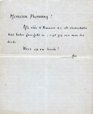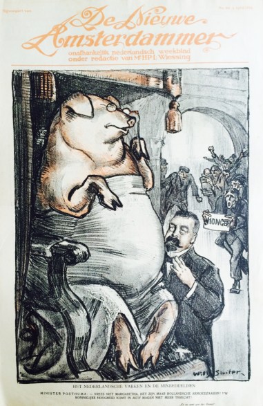 Als minister voerde Posthuma enkele wetten door die direct uit de oorlogseconomie voortvloeide. Hij was namelijk belast met het distributiesysteem voor voedsel (waaronder regeringsbrood en eenheidsworst) en moest daardoor veel impopulaire maatregelen nemen. Minister Posthuma had een zeer slechte reputatie en werd het symbool voor de schaarste die tijdens de oorlog in Nederland heerst en het mikpunt van kritiek over bijvoorbeeld het ‘regeringsbrood’. Hij werd bespot en gehaat sinds het begin van de Eerste Wereldoorlog. In het najaar van 1914 bepaalde hij bijvoorbeeld dat in het kader van zuinigheid witbrood zoveel mogelijk moest worden vervangen door bruinbrood, het zogenaamde regeringsbrood. Binnen het beleid van Posthuma konden boeren en tussenhandelaren grote winsten maken met het exporteren van goederen naar Duitsland. Het aanbod van goederen binnen Nederland kwam door de omvang van de export in het geding. Daardoor ontstond grote onvrede over de dreigende schaarste, de ongelijke verdeling van goederen en de winst die exporteurs maakten in het nadeel van het hongerlijdende volk. De oorlogswinstmakers (OW-ers) en minister Posthuma groeiden uit tot de meest gehate Nederlanders tijdens de Eerste Wereldoorlog. Het ging critici niet alleen om de wijze waarop de winst werd gemaakt, maar om de manier waarop de nieuw vergaarde rijkdom werd geëtaleerd. In De Nieuwe Amsterdammer, nummer 66 van 1 april 1916 (een uitgave van Henri Wiessing die tussen 1915 en 1920 verscheen) verscheen een sportprent van Willie Sluiter. Posthuma staat erop met zijn karakteristieke snor en stelt het varken Margaretha gerust dat zij niet zal worden opgegeten door de Hollandsche armoedzaaiers. Dat varkentje zou door Posthuma worden vertroeteld en vetgemest voor de export naar Duitsland. De naam ‘Margaretha’ past niet direct bij een varken en illustreert daarmee de bijzondere status van het Hollandse varken in de ogen van de minister. Het varken is geen voedsel voor de eigen bevolking (de hongerlijdende arbeiders op de prent), maar is een investeringsproduct voor boeren en handelaars. Op 15 mei verschijnt in nummer 68 van hetzelfde blad een tweede spotprent met felle kritiek op Folkert Posthuma, nu als een ober met een dienblad vol warm eten en flessen drank. Hij rijkt het dienblad aan mannen en vrouwen in nette kleding aan, terwijl hij neerkijkt op een groep hongerige burgers. De net geklede, welgestelde mannen en vrouwen zitten op zakken met geld, bedrukt met ‘Oorlogswinst’, waardoor ze bij het dienblad van Posthuma kunnen. De minister roept naar het volk dat als zij ook gebruik maken van hun oorlogswinst, dat zij ook van het lekkere eten kunnen genieten. Deze prent verbeeldt de kloof tussen arm en rijk, de ongelijke verdeling van voedingsmiddelen en de onvrede hierover onder het volk. In juni en juli 1917 leidde de onrust daarover in Amsterdam tot het Aardappeloproer.