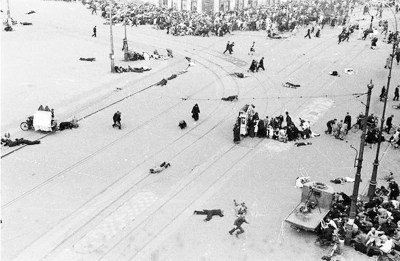 Intussen hadden zich al duizenden mensen op de Dam verzameld om een spontaan bevrijdingsfeest te beginnen. De bevrijders stonden immers aan de stadsgrens en men verwachten dat elk moment de Canadezen naar het stadscentrum zouden doortrekken. Er was muziek van draaiorgel ‘Het Snotneusje’ en mensen dansten in het rond. De stad was echter nog vol met gewapende Duitse militairen en milities van de Binnenlandse Strijdkrachten (BS). Maar aan die BS was door de geallieerden opgedragen om geen Duitsers te ontwapenen en zich niet gewapend op straat te vertonen. Rond drie uur ’s middags werd plotseling door Duitse militairen geschoten vanaf het balkon van De Groote Club, op de hoek van de Kalverstraat. Het is altijd onduidelijk gebleven waarom de Duitse militairen begonnen aan deze schietpartij die ongeveer twee uur duurde. Er is de mythe dat de schietpartij werd begonnen door gefrustreerde dronken soldaten, die het Duitse verlies niet konden verwerken, wellicht aangespoord door de beelden van kaalgeschoren ‘moffenhoeren’ en de vrees dat zij weleens konden worden gelyncht. Een serieuze theorie zegt de BS twee leden op de hoek van de Paleisstraat en Spuistraat aanhielden en wilden ontwapenen, waartegen en van hen zich verzette. Hij werd daarop door een BS-man doodgeschoten, wat voor een aantal Duitse zeemiliciens op het dak van De Groote Club de aanleiding was te schieten in de richting van deze BS’ers.