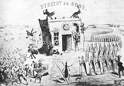 bleef nog decennialang ongewijzigd. Dat kwam onder meer tot uiting door het koninklijke Recht van Placet, die inhield dat het staatshoofd alle pause-lijke verordeningen moest goedkeuren voordat ze ook in Nederland van toepassing konden zijn. Het was dan ook niet verwonderlijk dat de katholieke politici zich aansloten bij de hervormingsgezinde liberalen onder leiding van Johan Rudolph Thorbecke, die onder meer dit soort archaïsche koninklijke voorrechten wilden afschaffen.