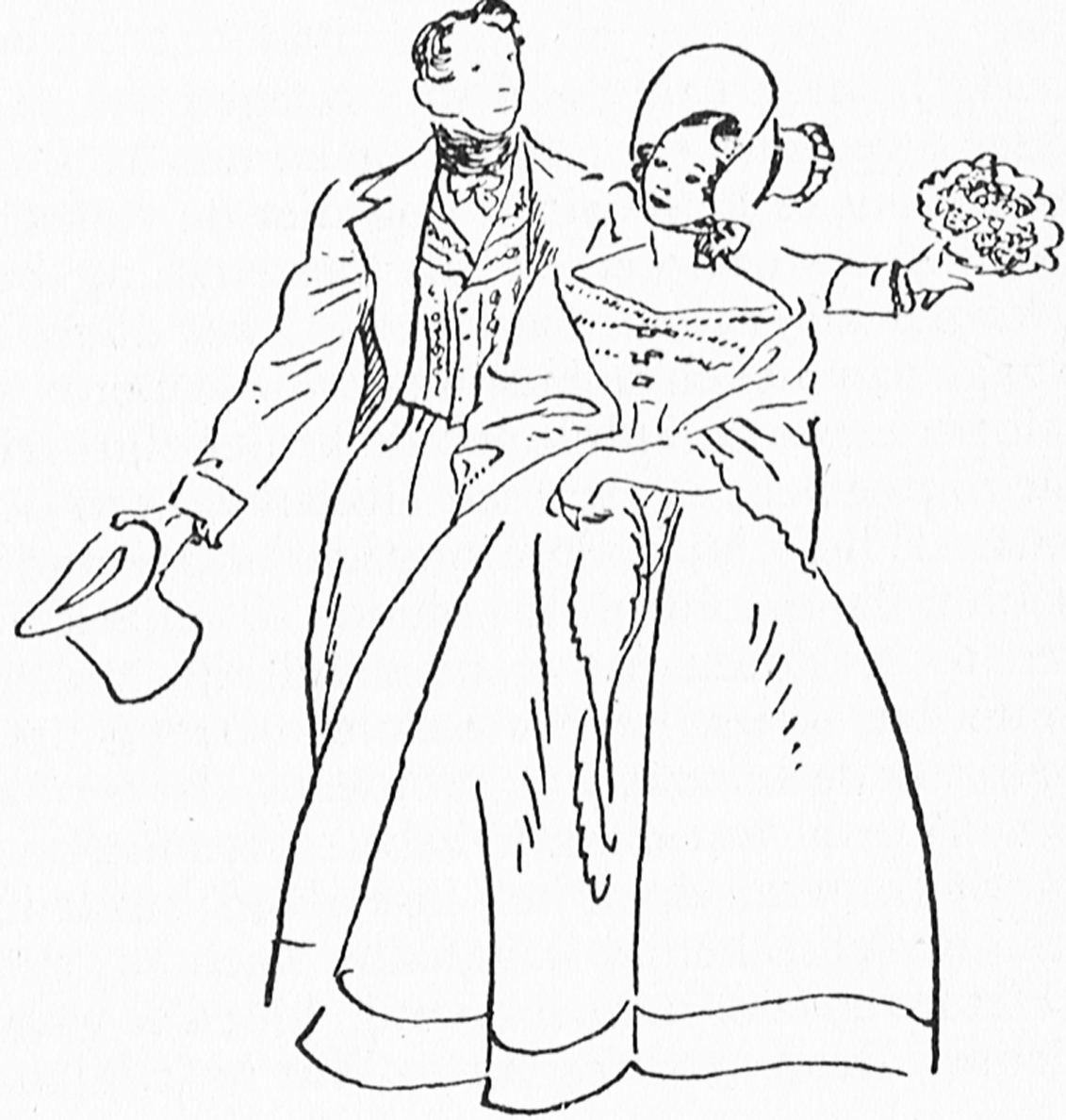Amelie zeeg ‘doodaf’, en waarschijnlijk met een halfhonderd steken in haar zij, op een stoel neder; maar op dit ogenblik ging de deur open, en de vrolijke Dolf van Brammen schoot met dezelfde uitgelatenheid op de persoon van Pieter af, die met een wijd duffelse buis aan, een rode bouffante van Teeuwis om de hals, en een pakje nat goed, in zijn zakdoek samengebonden, onder den arm, binnentrad; en dezelve Pieter ogenblikkelijk bij de linkerhand grijpende en zijn eigen rechter om Pieters midden slaande die vruchteloos zich poogde los te worstelen, galoppeerde hij met hem door de kamer, onder het juichen van dezelfde regels, die hem zoo bijzonder schenen te bevallen.