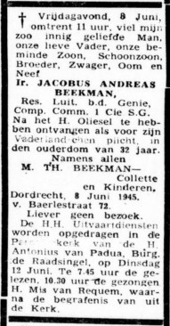 Jacobus Andreas Beekman (Delft, 17 augustus 1912 – Dordrecht, 8 juni 1945) was een Nederlandse verzetsstrijder tijdens de Tweede Wereldoorlog. Beekman was rooms-katholiek, gehuwd, vader van vier kinderen en woonachtig in de Van Baerlestraat in Dordrecht. In die plaats werkte als ingenieur bij de Meterfabriek (voluit: Maatschappij ter vervaardiging van gasmeters en toestellen voor gasfabrieken; deze uitgebreide bedrijfsnaam werd in de praktijk nooit gebruikt). De Meterfabriek was een metaalbewerkingsbedrijf dat vanaf 1858 in Dordrecht was gevestigd en zich na de opkomst van de lichtgasfabricage in het midden van de 19e eeuw bezighield met de reparatie van onderdelen zoals gasmeters. De Meterfabriek had een vooraanstaande positie binnen de Nederlandse gasbedrijven: zo’n 80% van de (munt)gasmeters kwam uit de Dordtse fabriek. Beekman was reserve-tweede-luitenant der Genie en tijdens de meidagen 1940 ingedeeld bij de Eerste Zoeklichtafdeling tegen luchtdoelen in de luchtverdedigingskring Amsterdam.In de loop van de oorlog raakte hij betrokken bij het verzet in zijn woonplaats. Zijn huis ging dienen als verzamelplaats van zijn Dordtse verzetsgroep.