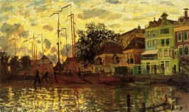 Claude Monet (Parijs, 14 november 1840 – Giverny, 5 december 1926), de Frans impressionistisch kunstschilder, bezocht Nederland drie keer in de jaren 1870-1880. In een eerste reeks van negen blogs is al bericht over alle schilderijen die Monet in 1874 in Amsterdam maakte (zes blogs), het schilderij dat hij in Zaandam maakte van juffrouw Guurtje van de Stadt (20 oktober 1854 – 5 januari 1936), de drie Zaanse schilderijen van de molen Het Oosterkattegat, de drie schilderijen in het Westzijderveld, in het buitengebied van Zaandam met haar vele molens, pittoreske slootjes en bruggetjes en de vier schilderijen van de Achterzaan, met het groene theehuis en het Parijs aandoende L’embarcadère. Hij maakte verder ook zeven stadsgezichten van de stad die midden in de negentiende eeuw nog helemaal gekenmerkt werd door de typische Zaanse groene houten huizen, molens en oude industriële panden. De Zaanstreek was belangrijk in de houtverwerking en voedingsmiddelenindustrie. Ooit was de streek de provisiekast van Nederland. Er hebben honderden molens gestaan. Op het hoogtepunt, rond 1720, waren er circa 600 molens gelijktijdig in bedrijf. In totaal zijn er ongeveer 1.100 verschillende molens in bedrijf geweest. Tientallen molens zijn in de loop der eeuwen herbouwd doordat hun voorganger werd verwoest door brand of storm. Ook werden er wel molens verplaatst. De stad kende in de 17e en 18e eeuw een grote economische voorspoed. Er was in Europa geen streek te vinden waar op zo’n kleine oppervlakte zoveel verschillende nijverheid te vinden was: weverijen, stijfselfabrieken, zeildoekmakerijen, papier, tabak, verf, kaarsen, snuif, blauwsel, cacao, kuiperijen, smederijen, traankokerijen, zagerijen, scheepsbouw, zeevaart, handel en veeteelt. Ook de walvisvaart was belangrijk, bijna elk dorp in de Zaanstreek deed er aan mee. In 1697 kwamen maar liefst 78 Groenlandvaarders met de vlag in top tegelijkertijd op hun thuisreis de Zaan opvaren. Zij brachten bijna 40.000 vaten walvisspek binnen. De dorpen en stadjes waren ook bekend om de vele houten huizen, doorgaans in typerend groen en wit geschilderd. Om echt een goede indruk te krijgen hoe het ooit de traditionele Zaanse bouwstijl eruit heeft gezien kan men terecht bij het openluchtmuseum de Zaanse Schans. Monet heeft zeven stadsgezichten in de oude Zaanstreek geschilderd.