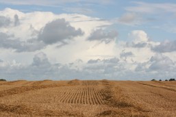 Het eerste doel vandaag is een rondreis rond het grote meer Saltbaek Vig. Volgens de kaart moet dan kunnen via een smal pad dat langs de oostkant van het meer naar het punt gaat waar meer en zee bijna bij elkaar komen. Via een dam zou dan naar de westelijke oever van het meer kunnen worden gereden. Aan het begin eerst genoten van een aantal indrukwekkende landschappen, gele velden waar het graan nog maar net vanaf is en dreigende wolkpartijen.
