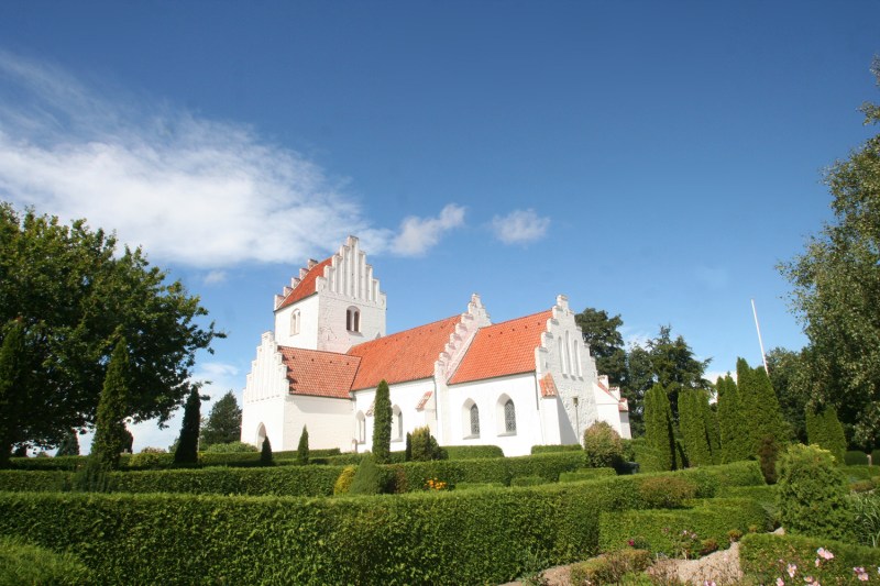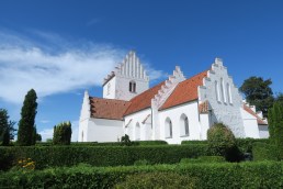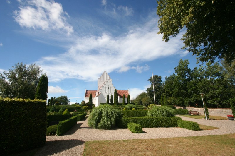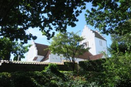 Het eerste doel vandaag is een rondreis rond het grote meer Saltbaek Vig. Volgens de kaart moet dan kunnen via een smal pad dat langs de oostkant van het meer naar het punt gaat waar meer en zee bijna bij elkaar komen. Via een dam zou dan naar de westelijke oever van het meer kunnen worden gereden. Aan het begin eerst genoten van een aantal indrukwekkende landschappen, gele velden waar het graan nog maar net vanaf is en dreigende wolkpartijen. En ineens een aantal koeien die bijna in zee liggen te herkauwen; een wolfachtige hond op de voorgrond. Iets verderop was de weg afgesloten, want het is blijkbaar grotendeels beschermd natuurgebied. Dus de weg terug om toch in het plaatsje Saltbaek uit te komen. Onderweg eerst langs het dorpje Sprangbro en een stop bij een van de prachtige witte kerkjes op het platteland, ditmaal in Tommerup.