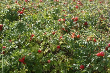 Het eerste doel vandaag is een rondreis rond het grote meer Saltbaek Vig. Volgens de kaart moet dan kunnen via een smal pad dat langs de oostkant van het meer naar het punt gaat waar meer en zee bijna bij elkaar komen. Via een dam zou dan naar de westelijke oever van het meer kunnen worden gereden. Aan het begin eerst genoten van een aantal indrukwekkende landschappen, gele velden waar het graan nog maar net vanaf is en dreigende wolkpartijen. En ineens een aantal koeien die bijna in zee liggen te herkauwen; een wolfachtige hond op de voorgrond. Iets verderop was de weg afgesloten, want het is blijkbaar grotendeels beschermd natuurgebied. Dus de weg terug om toch in het plaatsje Saltbaek uit te komen. Onderweg eerst langs het dorpje Sprangbro en een stop bij een van de prachtige witte kerkjes op het platteland, ditmaal in Tommerup. Mooi kerkje met zoals het hoort eeuwenoude muren langs de begraafplaats, vol mossen. Een geweldig onderhouden begraafplaats trouwens met tal van bloemen. De weg langs het kerkje ligt een stuk dieper, zodat je slechts wat autodaken langs ziet komen. In Saltbaek de auto weggezet op de parkeerplaats langs het strand. Een meter of honderd naar rechts ligt dat dammetje dat we eerder die dag hadden gehoopt te kunnen passeren. Rechts een veld met zuring en bloemen. Maar ook hier waarschuwings- en verbodsborden, op het punt waar de Tranemose Grøft onder de dam doorloopt en dan in zee uitkomt. Dan maar een kleine strandwandeling gemaakt. Zo af en toe vliegt een eenzame vogel over. Het strand is bezaaid met allerlei soorten stenen en langs de kant enorme struiken met rozebottels.