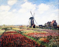 Claude Monet (Parijs, 14 november 1840 – Giverny, 5 december 1926), de Frans impressionistisch kunstschilder, bezocht Nederland drie keer in de jaren 1870-1880. In 1871 verbleef hij vier maanden in Zaandam, begin 1874 bezocht hij Amsterdam en in 1886 werkte hij in de bollenstreek. Tijdens deze verblijven zou hij 42 schilderijen maken met typisch Hollandse onderwerpen als riviergezichten met molens en bootjes, stadsgezichten van Amsterdam en tulpenvelden. Over de bezoeken aan Zaandam en Amsterdam is in twaalf blogs al bericht. In dit afsluitende blog wordt bericht over Monets laatste bezoek aan Nederland in mei 1886, op uitnodiging van de Franse ambassade. Hij was toen al duidelijk meer bekend dan begin jaren 1870, zodat er in de media bericht werd over het bezoek van de Franse schilder. Ongeveer een maand lang verbleef hij in Den Haag, maar dat verblijf heeft hem blijkbaar niet kunnen inspireren tot het maken van schilderijen. In plaats daarvan trok hij met zijn schildersspullen een maand lang door de bollenstreek om er de tulpenvelden in de buurt van Rijnsburg en Sassenheim te schilderen. In tijdschrift De Portefeuille stond daarover te lezen dat ‘… de bonte schakering dier bloemen, even schitterend als Perzische kleedjes, ongetwijfeld veel aantrekkelijks moeten hebben voor dien schilder’. In tegenstelling tot zijn eerdere bezoeken had hij deze keer goed weer, maar niet veel tijd. De vijf schilderijen die hij er schilderde (twee in de omgeving van Sassenheim en drie in de buurt van Rijnsburg, met de molens) heeft hij vrijwel allemaal nog in Frankrijk af moeten maken. Een aantal werken lijken ook enigszins haastig gemaakt, leunen op een globaal uitgewerkte onderschildering Ze horen zeker niet tot zijn sterkste werken, maar kennen vanwege de kleurenpracht een bijzondere levendigheid.