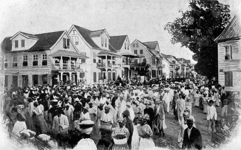 Eindelijk wordt de gewone pas weer aangenomen, en met zwaaiende armen gaat men den kortsten weg langs, naar de begraafplaats. Niets bijzonders doet zich onderweg voor, of men moet het eerbiedig ontblooten van het hoofd door ieder, die wij passeeren of die ons tegenkomt, onder de bijzonderheden willen rekenen. We zijn bij de begraafplaats! Van den ingang af, wordt de baar aan de hand gedragen tot op de plaats, waar de graver bij de groeve staat. Daar wordt de baar neergezet – de kist afgenomen en door middel van twee dikke touwen neergelaten. Bij de opgedolven aarde staan eenige spaden en naar orde van bloedverwantschap worden een weinig aarde op de kist gegooid. Nogmaals komen de a’s e’s en i’s aan de beurt, maar het open veld is geen geschikt terrein voor muzikale uitvoeringen, en de zangers hiervan bewust – schijnt het – houden spoedig op, en maken nu gebruik van den inhoud der kruiken. Mijne nêné is mij intusschen genaderd, en verzoekt mij ‘iets’ te spreken bij het graf van hare moeder. Ik kan mij tot heden niet verklaren hoe het goede mensch daaraan kwam, of ’t moet zijn, dat ze eens eene teraardebestelling van een aanzienlijke had bijgewoond, en nu hare moeder wou deelachtig maken aan wat zij den ‘bakra’ had zien nageven in zijn graf!