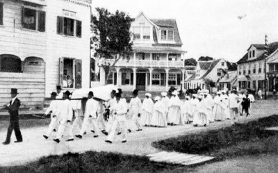 De baar wordt door de dragers op de schouders genomen, en ’t ging eerst langzaam en vervolgens in den gewonen pas voorwaarts! Terwijl de stoet voort marcheert zal ik Uwe aandacht op een en ander vestigen: Vóór de kist loopt de lijkbezorger in gala – maar ik moet het eerlijk bekennen, dat als de woordafleiding ‘gala’ bij ‘gal’ gezocht wordt, die woordafleiding door de kleur van de ‘gala’ gerechtvaardigd is. Op den ‘krebs’ dus volgt de kist op de baar, door acht dragers op de schouders getorscht. Deze dragers zijn allen in het wit gekleed en hebben hooge zwarte hoeden op het hoofd – brouwers geheeten -. Daar deze ‘brouwers’ presentjes zijn, die vroeger andere hoofden hebben versierd, is het niet te verwonderen dat hij bij den een tot over de ooren zakt, terwijl hij bij een ander als bij een dandy op drie haartjes rust. Maar evenmin zal men verwonderd zijn, als ik zeg, dat het zwart dier hoeden gevarieerd is van roodzwart, blauwachtig grijs-zwart, groen-zwart tot alle mogelijke soorten zwart, bij een hoogen hoed behoorende, en die hoed reeds mogelijk 25 overdienstjaren in wind en weer heeft gehad.