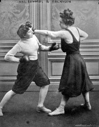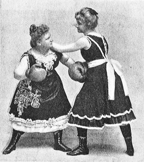 Bij de weinige vrouwelijke boxers rond 1900 kan men bij een enkeling (Hattie Stewart) aan de kleding zien dat die serieus met boksen bezig was, maar bij anderen (Hattie Madden) met haar kolderieke kledij is het overduidelijk dat het op zijn best een goede vaudeville-act of circusnummer was en op zijn slechts plat vermaak in de categorie ‘rariteitenkabinet’. Zie bijvoorbeeld de outfit waarmee de Carlson Sisters optraden. Het is schier onmogelijk voor te stellen dat deze zwaarlijvige zusjes in deze pakjes die maar beperkte bewegingsvrijheid gaven een overtuigende sportieve prestatie op de mat lieten zien. Dat gold natuurlijk ook voor de Gordon Sisters, twee boksende keukenmeiden. Trouwens, ook al een opvallend gegeven … vaak werd opgetreden in ‘sister-verband’, waarbij het niet altijd duidelijk was of het daadwerkelijk zussen waren. Dat de dames blijkbaar altijd tegen elkaar uitkwamen, geeft al aan dat het vaudeville moet zijn geweest. Nog zo’n act vormden de Bennett Sisters, die niet alleen aan boksen maar ook aan worstelen deden. In hun voordeel moet worden gezegd dat ze het figuur en de kleding van een echte sportvrouw hadden. Dat gold ook voor een ander duo, Fraulein Kussin and Mrs. Rose Edwards. Van de laatste is bekend dat ze de echtgenote was van de beroepsbokser Joe Edwards. Er mag dus worden verondersteld dat hun partij technisch van een redelijk niveau was. Beiden dames kwamen op 7 maart 1912 in een officiële wedstrijd tegen elkaar uit; de uiteindelijke uitslag is niet bekend. Een dag voor het duel werden enkele persfoto’s gemaakt.