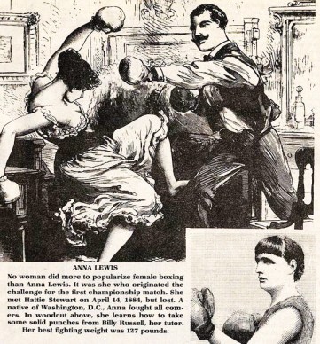 Dezelfde Police Gazette berichtte op 4 april 1884 over her gevecht van Hattie Stewart tegen Anna Lewis: ‘No woman did more to popularize female boxing than Anna Lewis. It was she who originated the challenge for the first Championship match. She met Hattie Stewart (question is this Hattie Leslie) on April 14, 1884. She lost the fight. Lewis was a native of Washington D.C. She fought all comers. In a photo below they picture her learning how to take solid punches from Billy Russell, her tutor. Her best fighting weight was 127 lbs.’