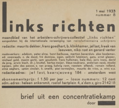 Van het ‘arbeiders-schrijverscollectief’ Links Richten verschenen in de jaren 1932 en 1933 elf nummers van een gelijknamige tijdschrift. In een eerder blog is uit nr 3 Leve de Burgeroorlog van Johan Miera geplaatst, waarin hij de gezapige burgers waarschuwt voor de dreiging van het opkomende fascisme en nationaalsocialisme. Nummer 8, dat in mei 1933 verschijnt, is speciaal gericht op alle antifascistische actie en is bedoeld donateurs te werven voor het op initiatief van de dichteres, socialiste en activiste Henriette Roland Holst (Noordwijk-Binnen, 24 december 1869 – Amsterdam, 21 november 1952) en wiskundige, filosoof en socialist Gerrit Mannoury (Wormerveer, 17 mei 1867 – Amsterdam, 30 januari 1956) opgerichte Komitee K.H., wat staat voor ‘protestkomitee van kunstenaars en hoofdarbeiders ter behartiging van de belangen van vervolgden in den strijd tegen imperialisme en fascisme’. Mannoury was juist in 1932 geroyeerd door de Communistiche Partij Holland (CPH) omdat hij het opnam voor Leon Trotski, die door Stalin ten val was gebracht en verbannen. Nadien bleef Mannoury politiek actief voor gerechtigheid en tegen de doodstraf.In haar openingsverklaring begint het Komitee K.H. met de volgende woorden: ‘In steeds toenemende mate nemen in den laatsten tijd de machtsmiddelen, waarvan de naar imperialisme strevende regeeringen gebruik maken ter bestrijding hunner tegenstanders, vormen aan die de geestesontwikkeling der volkeren belemmeren en een ernstig gevaar opleveren voor de wereldkultuur. Bruut geweld treedt in de plaats van uitwisseling der gedachten en het toebrengen van lichamelijk en geestelijk leed aan de tegenstanders schijnt meer en meer het hoofddoel te worden voor de door haat en vrees verblinde machthebbers. Het Digoelkamp in Indonesië, het bloedbad op de ‘Zeven Provinciën’, de met iedere schijn van recht spottende vervolging van de Kom in Suriname, zijn voorbeelden van dat bruut geweld in eigen land; het Scottsboro-proces en de Duitsche terreur zijn recente en sprekende blijken van het heerschen van denzelfden geest in het buitenland. Reeds herhaaldelijk hebben vele kunstenaars en hoofdarbeiders in alle landen der aarde getuigenis afgelegd van de verontwaardiging welke deze geweldadige onderdrukkingsmaatregelen bij hen opwekken en van hun solidariteit met de klassen en rassen tegen dewelke die onderdrukking is, gericht.’