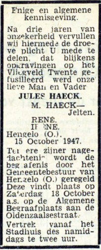 Jules Haeck (Croix, Frankrijk, 1 september 1894 – Weerselo, 7 oktober 1944) was vanuit zijn geboorteland Frankrijk in 1918 naar Hengelo verhuisd, nadat hij aan het eind van de Eerste Wereldoorlog uit het Franse leger was gedeserteerd en eerst naar België was getrokken en daar ontsnapte gevangenen had geholpen. In Hengelo werd hij eerst kostganger in het gezin van de familie van Sietse Dekema. In 1925 begonnen hij samen met Sietse een groothandel in groente en fruit, de firma S. Dekema & J. Haeck. De firma zou tot 1931 blijven bestaan. In sommige publicaties over Haeck wordt abusievelijk gezegd dat hij in Hengelo een groenteventer was. Bij de Dekema’s ontmoette hij Manie Jetten. Ze besloten niet in het huwelijk te treden, maar als partners verder samen te leven. In september 1933 verhuisde naar Arnhem, waar in januari 1934 werd hier de tweeling René en Irene geboren. In november 1934 waren ze weer terug in Hengelo en zette Jules een nieuwe groothandel in groenten en fruit op. De zaak zou bij een bombardement op 7 oktober 1944 volledig worden verwoest.
