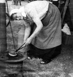 Henderkien nam het spekzwoertje en maakte haar ijzer vet. Zij nam de lepel en het beslag liep snisterend op het hete ijzer. Dan kneep ze de twee bladen op elkaar, hield het ijzer één of twee minuten in het knetterende vuur, dan was er weer één klaar. Garrit-Jan rolde de hete koek om de breischee tot een kokertje, dat direct onder zijn langzame handen hard werd. Een mooi ijzer had Henderkien. Het was al meer dan honderd jaar in de familie en er stonden de voorletters van haar overgrootmoeder nog in. Er waren weinig mensen die zo’n mooi ijzer hadden. Dat moesten de kinderen ook waarderen, dat ze zulke mooie koeken kregen, dan konden ze toch haast met een minder toe!