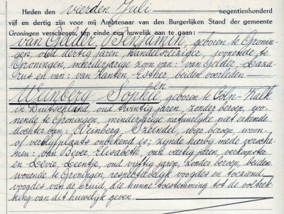 Ergens in 1933-1934 moet Sophia de handelsreiziger Van Gelder hebben ontmoet. Op 4 juli 1935 trad ze met hem in Groningen in het huwelijk. De huwelijksacte vermeldde dat de minderjarige Sophia de niet-erkende dochter was van Szaindel Weinberg, waarvan ook geen beroep, woon- of verblijfplaats bekend was. Het echtpaar moet het wel degelijk hebben geweten dat zij toen in Tilburg woonde, want ze vertrokken direct na de huwelijksvoltrekking naar de Nicolaas Beetsstraat 3 te Tilburg, waar ze 2,5 maand (4 juli 1935 tot 20 september 1935) woonde. Op 20 september 1935 vertrokken ze naar Amsterdam, waar ze zich vestigde in Amstellaan 27-II. Dar werd op 7 maart 1939 de tweeling Leo en Max van Gelder geboren.