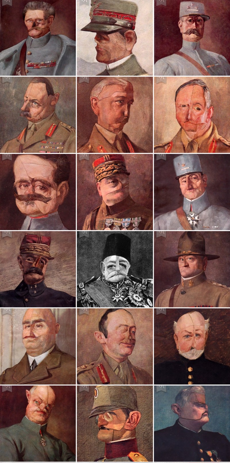 Onlangs stuitte ik op een reeks fascinerende schilderijen of collages. Zo zouden gemaakt zijn door een zekere René Apallec, die in 1896 zou zijn geboren in het plaatsje Bolbec, dat deel uitmaakt van de regio Le Havre. Volgens de overlevering werd zijn werk pas in 2007 ontdekt toen de nagelaten werken van de rond 1980 overleden Apallec in een galerie in Toulouse werd verkocht. Een site vermeldde dat er zo goed als niets bekend was van de man, die tijdens de Eerste Wereldoorlog als verpleger aan het front zou hebben gewerkt. Er waren echter geen documenten om dat te staven. Na de oorlog zou hij nog twee jaar in Le Havre hebben gewerkt, voordat hij en zijn partner zich in 1923 definitief vestigden in Toulouse. Omdat hij geen deel uitmaakte van een artistieke beweging of familie, produceerde René Apallec een groot deel van zijn werk in het geheim en weigerde zijn collages te exposeren, met name de serie Gueules Cassées (Gebroken Gezichten), die hij politiek incorrect vond. Als ‘papieren plastisch chirurg’ vervormde hij verzamelde geschilderde portretten en creëerde nieuwe portretten van generaals en maarschalken, die de afgrijselijkheid en absurditeit van de oorlog illustreerde. Met zijn werk wilde hij hulde brengen aan de vele miljoenen slachtoffers van de ‘La Grande Guerre’, de oorlog die alle oorlogen zou eindigen. En vooral de vele misvormde soldaten eren die door de officieren naar de slachtbank werden gestuurd. Hun littekens op hun gezichten maakten zichtbaar hoe invaliderend en traumatisch het oorlogsvoeren was geweest. De kunstenaar verkleinde afbeeldingen van beroemdheden met scalpelstreken, hechtingen en verstelwerk. Maar het is een verzonnen verhaal, magistraal verzonnen weliswaar, maar er heeft nooit ene René Apallec bestaan. Het werk is van Hervé Laplace, een kunstenaar die zich helemaal heeft toegelegd op het maken van collages. De serie met honderd Gueules Cassées is slechts een van de vele soortgelijke serie die hij produceerde.