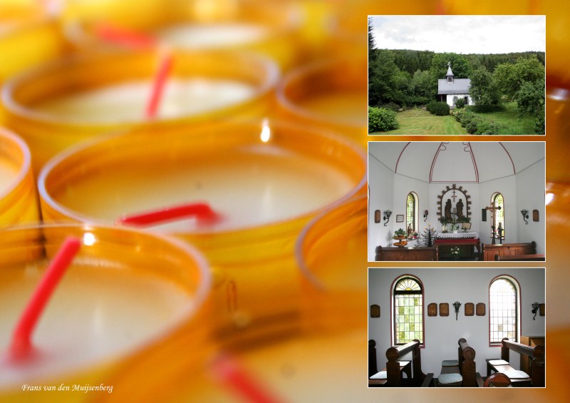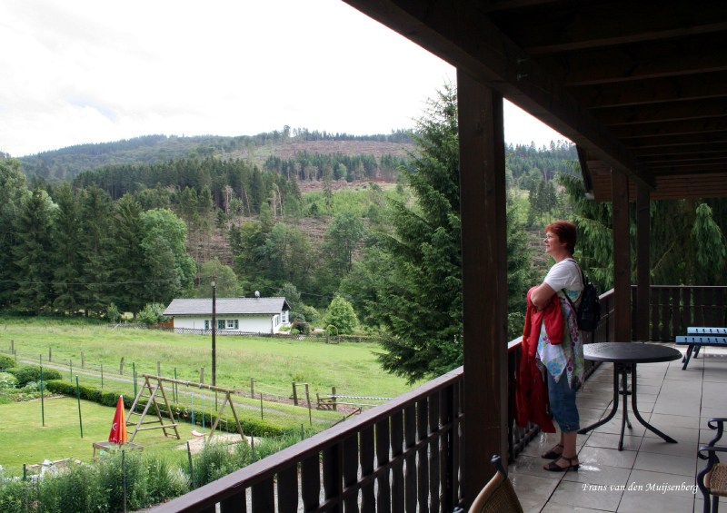 Het moet gezegd, het was een verrassend mooie kapel. Een oase van rust zou je kunnen zeggen, maar hotel en kapel stonden al eenzaam op de Eisenberg. De hele omgeving was een grote rustige oase. Een oase binnen de oase, je kunt ook overdrijven! De kapel stond vanuit het hotel aan het begin van de aanlooproute naar boven op de Eisenberg. We kwamen er de daarop volgende dagen steeds langs. Soms keken we even naar binnen, meestal liepen we er achteloos aan voorbij. We hebben er tijdens ons verblijf in Schinkenwirt nooit een ander naar binnen zien gaan. We leven in een goddeloze wereld, dat werd maar weer eens bewezen. Je zou haast denken dat die God toch bestaat en de mensheid zo af en toe flink op zijn donder geeft, als straf dat de meesten hem zijn vergeten. Toen we iets later in het hotel waren ingecheckt, konden we vanaf het balkon voor het eerst de schade zien die de Kyrill-storm in februari van dat jaar had aangericht. Het was een kleine voorbode van de schade aan de bossen in Sauerland die we de volgende dagen zou zien. Dinie stond die eerste dag die schade echter nog glimlachend te bekijken, bijna Bijbels: ‘En ze zag dat het goed was!’, straalde ze uit.
