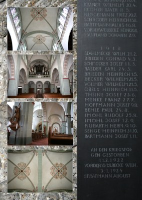 Daarna volgde een rotonde, die we konden oversteken om via de Bahnhofstrasse uit te komen in de Kirchstrasse. Daar torentje de Pfarrkirche St. Nikolaus hoog boven de huizen uit. Die werd in de jaren 1900-1903 gebouwd op de plaats waar al vanaf 1270 een kapel zou hebben gestaan. De restanten daarvan zijn in de gewelven van de kerk nog te zien. Blijkbaar wordt deze kerk voor het toeristenvolk niet erg belangrijk gevonden, want er is verdomd weinig informatie over te vinden. Wat ons er niet van weerhield naar binnen te gaan. Dat zou een vaste gewoonte worden op al onze latere vakanties en uitstapjes. Overal waar we kwamen, werd het religieuze gebouw bezocht. Protserige katholieke kerken, somber ingerichte protestantse kerken, kleine synagogen die de laatste eeuw hebben overleefd en majestueuze moskeeën, allemaal werden ze bekeken. Een buitenstaander moet wel denken met een erg gelovig tweetal te maken te hebben. Dat viel wel mee. Het zijn echter vaak architectonische kunstwerken, vol cultuur en symboliek. In deze Sint Nikolaaskerk bijvoorbeeld bevonden zich veertien indrukwekkende glas-in-loodvensters uit 1945 (‘Die Fenster’) van Wilhelm Sommer. Olsberg werd vanaf september 1944 door de geallieerden zwaar gebombardeerd om het spoor en de ijzersmelterijen te treffen. Het kan niet anders dat de kerk daarbij ook flink beschadigd is geraakt en er behoefte was aan nieuwe ramen. In 1984 zijn er nog een aantal moderne glas-in-loodramen van Nikolaus Bette aan toegevoegd. Ook het orgel schijnt ver na de oorlog te zijn geplaatst en de hele schildering van muren en plafonds doet erg eigentijd aan. De kerk moet in de oorlogsjaren gigantisch beschadigd zijn geweest en daarna opnieuw zijn gebouwd. De Eerste en Tweede Wereldoorlog komt in een hoek van de kerk terug in een monument waar de gevallenen van beide vernietingsslagen werden herdacht. Eindeloze rijen gesneuvelden vanuit een stadje dat ten tijde van 1914-1918 slechts enkele duizenden inwoners moet hebben gekend.