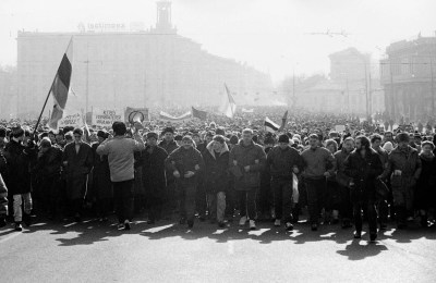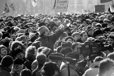 10 maart 1991, Moskou. Tot een half miljoen mensen demonstreerden tegen de regering op het Manezhnayaplein in het centrum van de stad. Ze eisten het aftreden van Sovjetpresident Michail Gorbatsjov en steunden Boris Jeltsin. De demonstratie vond plaats aan de vooravond van het referendum over het behoud van de USSR en de organisatoren riepen op tot een nee-stem.