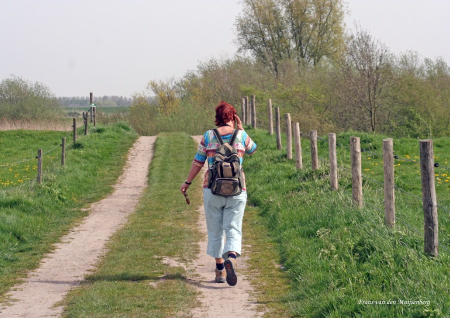 Rijnstrangen, een Natura 2000-gebied bij Pannerden, tussen Lobith en Pannerden, 27 april 2008, begin van de wandeling in Aerdt, langs de Aerdtsedijk, Dinie op weg naar de trekpont Aerdt, copyright F. van den Muijsenberg.